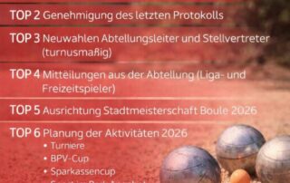 Einladung zur Abteilungssitzung Boule am 06.02.2026 um 18:00 Uhr Ort: Anlage TV 1848 e.V., Jugendraum TOP 1 Begrüßung TOP 2 [...]