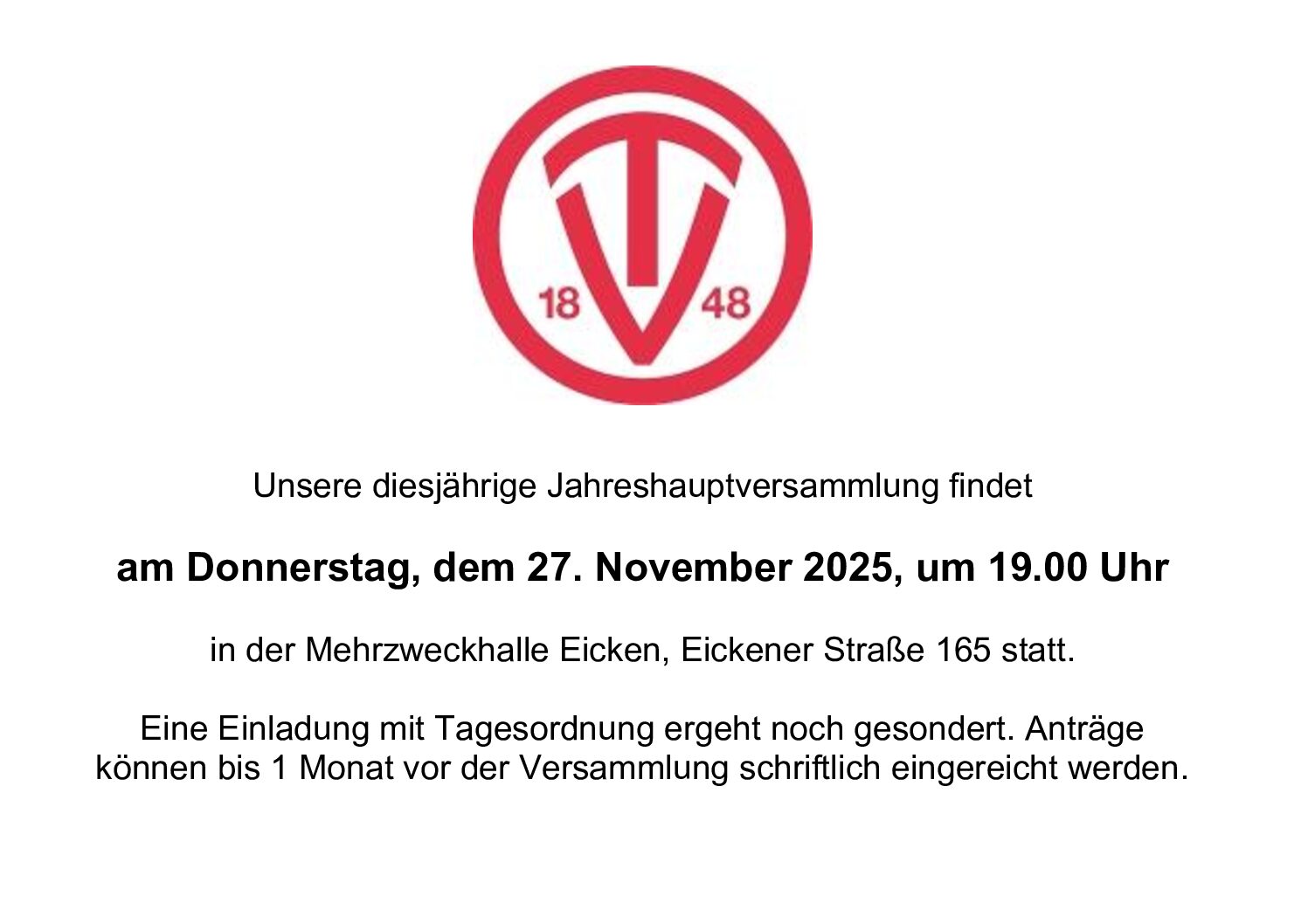 Liebe Mitglieder, unsere diesjährige Jahreshauptversammlung findet am Donnerstag, dem 27. November 2025, um 19.00 Uhr in der Mehrzweckhalle Eicken, Eickener Straße 165 statt. Eine Einladung mit Tagesordnung ergeht noch gesondert. Anträge können bis 1 Monat [...]