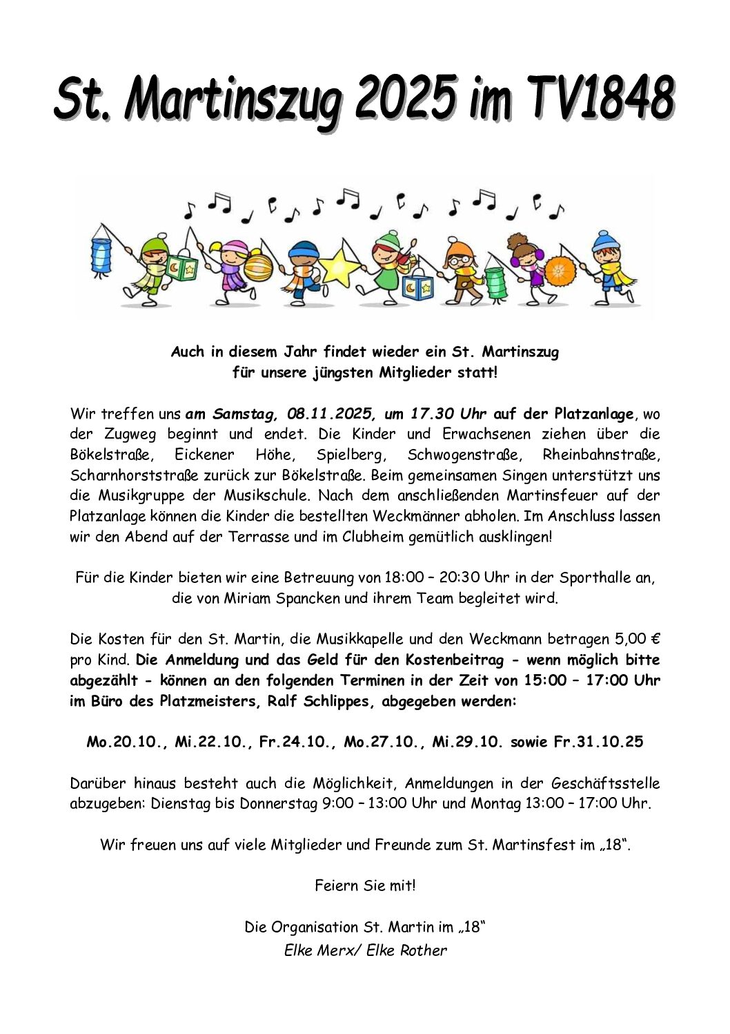 👧👦 Kinderflohmarkt 📅 Sonntag, 26. Oktober 2025 🕚 11:00 – 16:00 Uhr 📍 Vereinsheim TV1848 Spielsachen, Kleidung und viele kleine Schätze warten auf euch – oder seid selbst mit einem Stand dabei! 👉 Standanmeldung: 📧 [...]