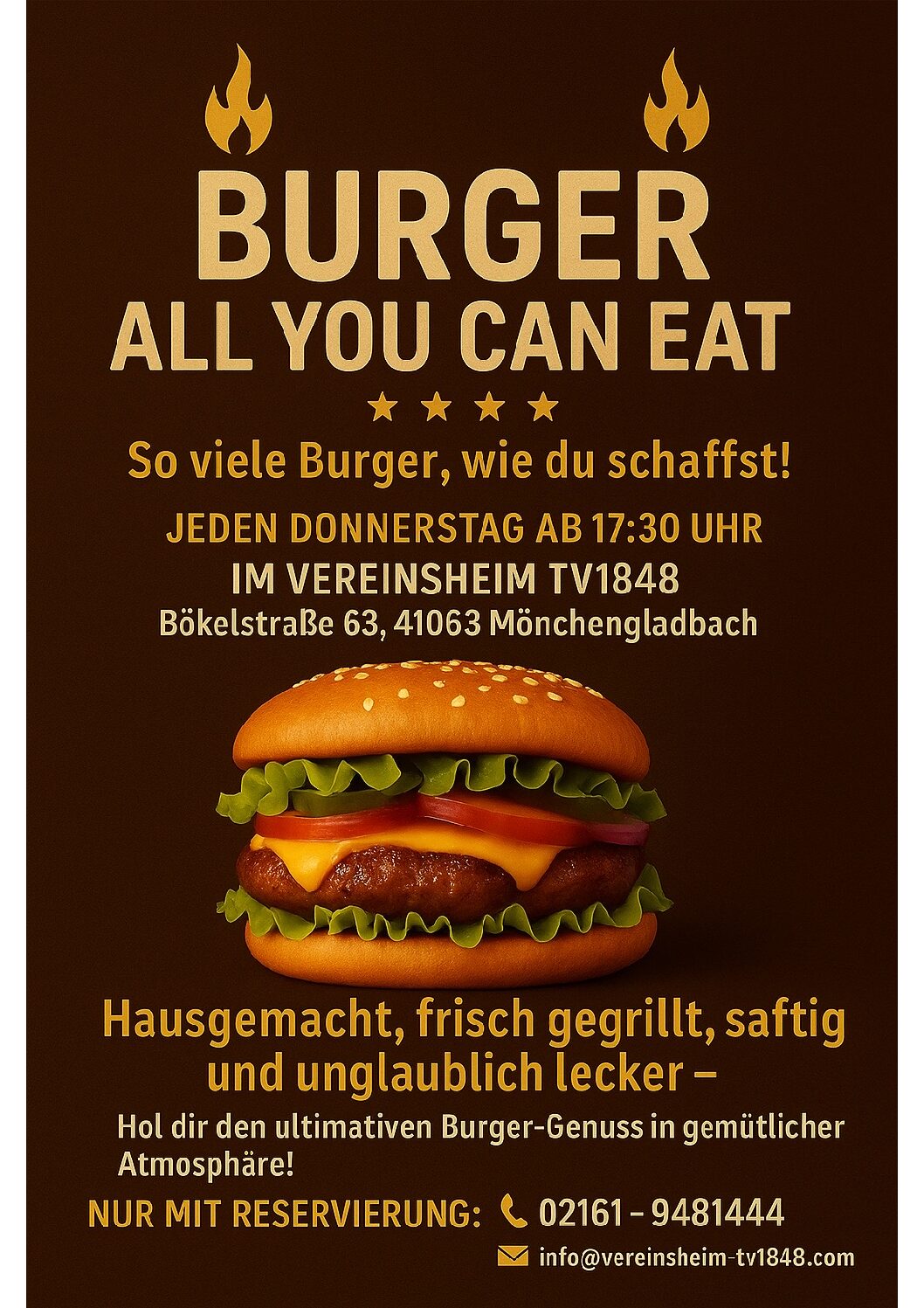 🍔 Burger All You Can Eat – jeden Donnerstag! 📅 Immer donnerstags ab 17:30 Uhr 📍 Vereinsheim TV1848 So viele Burger, wie ihr schafft – frisch gegrillt, hausgemacht und unglaublich lecker! Perfekt für einen gemütlichen [...]