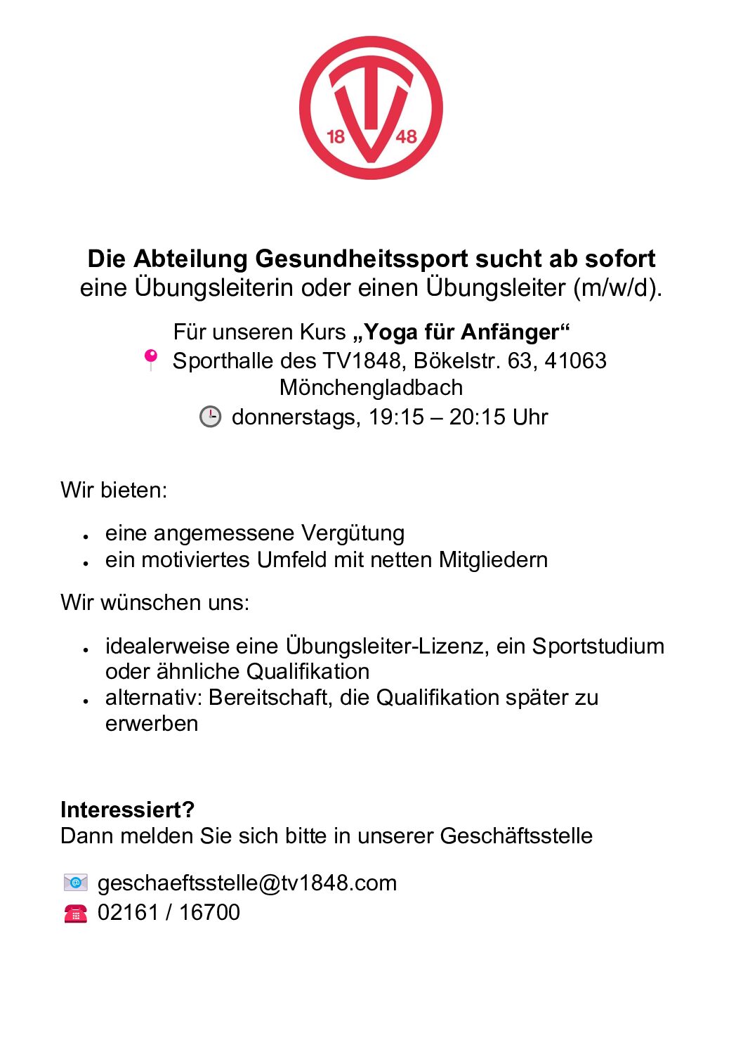 Die Abteilung Gesundheitssport sucht ab sofort eine Übungsleiterin oder einen Übungsleiter (m/w/d). Für unseren Kurs „Yoga für Anfänger“ 📍 Sporthalle des TV1848, Bökelstr. 63, 41063 Mönchengladbach 🕒 donnerstags, 19:15 – 20:15 Uhr Wir bieten: [...]
