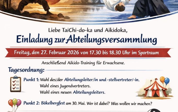 Liebe TaiChi-do-ka und Aikidoka, herzlich lade ich Euch zur Abteilungsversammlung am Freitag, den 27. Februar 2026 von 17.30 bis 18.30 Uhr in den Sportraum ein. Anschließend findet das Aikido-Training für Erwachsene statt. Bitte schreibt mir [...]
